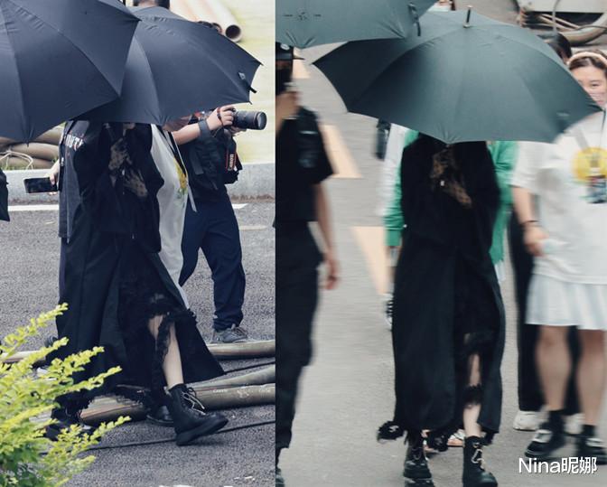 可以看到颖宝这身ALL BLACK的打扮真是绝了,经典的暗黑女团风,格外地抢眼,踩着马丁靴,配上风衣外套,像极了女巫。