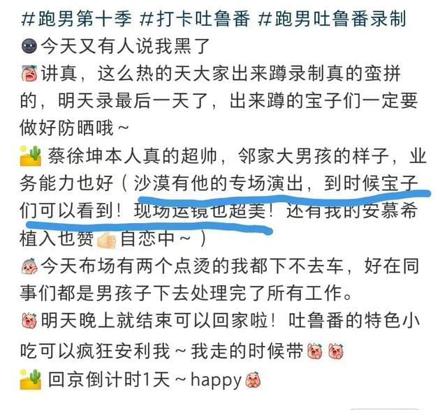 蔡徐坤在预热新歌发行的同时也让观众持续锁定《奔跑吧》节目的播出,表示节目中会有更多的惊喜等待着大家。据悉,节目组在昨晚举办了一场沙漠舞会,更是有属于蔡徐坤的专场演出!这个舞台就是蔡徐坤的新歌首唱吧(只是在沙漠中唱歌,真的不会嘴里进沙吗哈哈哈)。别出心裁的舞台真是让人期待不已呢,前面才有《情人》的水舞台,这次又要有沙漠舞台了,现在只想着节目能够早一点播出,让我们一睹新舞台的风貌!