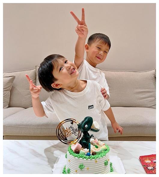 小寿星穿着黄色的T恤,戴着绿色的棒球帽,皮肤白皙,小脸肉嘟嘟的软萌可爱。可以看出哥哥李奕霆像爸爸多一些,脸型和下颌都一模一样。而弟弟则更像妈妈多点,清秀帅气。小寿星还不忘对着镜头嘟嘴比耶,想必生日这天玩一定得很开心了。