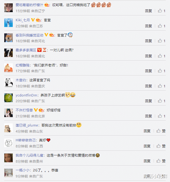 网友看后纷纷留言评论:“哎呦好甜啊”“这狗粮我吃了”“终于官宣了”“这是一条关于友情和爱情的博文”“不愧是老夫老妻,磕到了磕到了”。