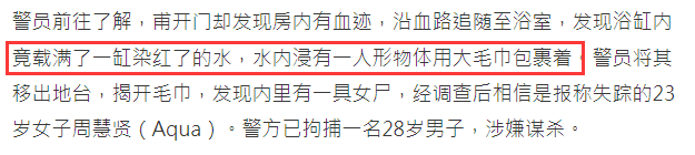 在周慧贤所住酒店的浴室里,发现周慧贤的时候,她已经失去了生命的气息,她躺在血泊中,身上多处被利器刺伤的伤口。