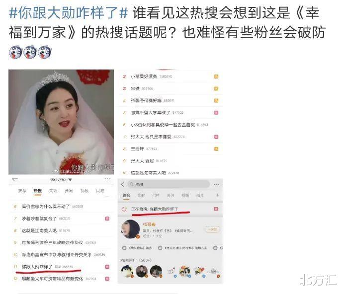 只是他大女儿和二女儿毕竟还没有正式进入娱乐圈,吃相这么难看很容易遭到反噬的,比如他大女儿多多,现如今就有点腥风血雨“流量体质”的意思了,每每上热门都会被逆反网友手撕,他要是再这么搞下去的话,他二女儿也得走上这个路子。对了,顺带提一嘴孙莉,孙莉最近在播的那个剧数据不太可,营销这块始终没能跟上来,本来孙莉还想趁着这个复出的机会多接几部剧的,当下这个美梦也要破灭了~3.杨幂赵丽颖赵丽颖新剧开播,第一天的热度颇高,话题度也不错,已经有了爆款剧的苗头了,尤其是剧情方面,上来就是“王炸”,农村婚闹这事看得真揪心。不过争议比较大的是,赵丽颖在新剧中被吐槽隔空内涵到杨幂了,她有句台词是“你跟大勋咋样了”(她剧中的妹妹还回答“大勋他不要我了”)……虽然之前没有正式官宣过,但谁都知道,杨幂的的前男友是魏大勋!