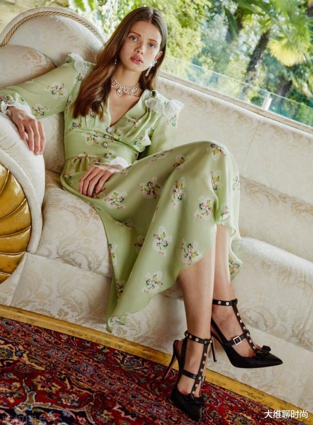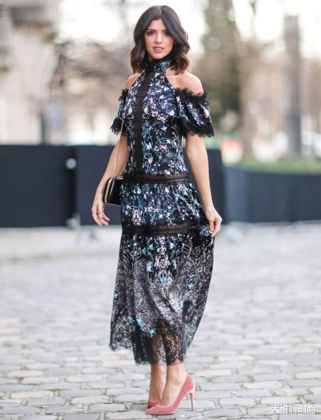 一条考究的碎花连衣裙,肌肤适度地露出来,哪怕是暗色调,加上用蕾丝拼接,搭配暗粉色高跟鞋,露出脚踝,和肩部的肌肤,精致感就会有所提升。