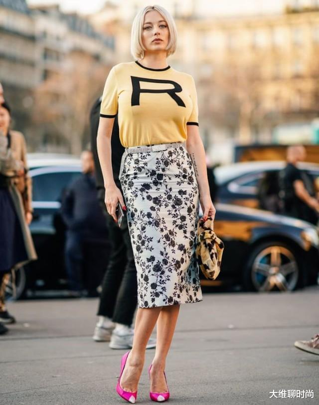 柔和的黄色上衣,和带有花卉图案的紧身裙,用半身裙的印花来体现美感,用粉色高跟鞋,为整体增添了视觉冲击力和甜美感。以其优雅的轮廓和高度时尚的色彩,吸引了别人的目光。
