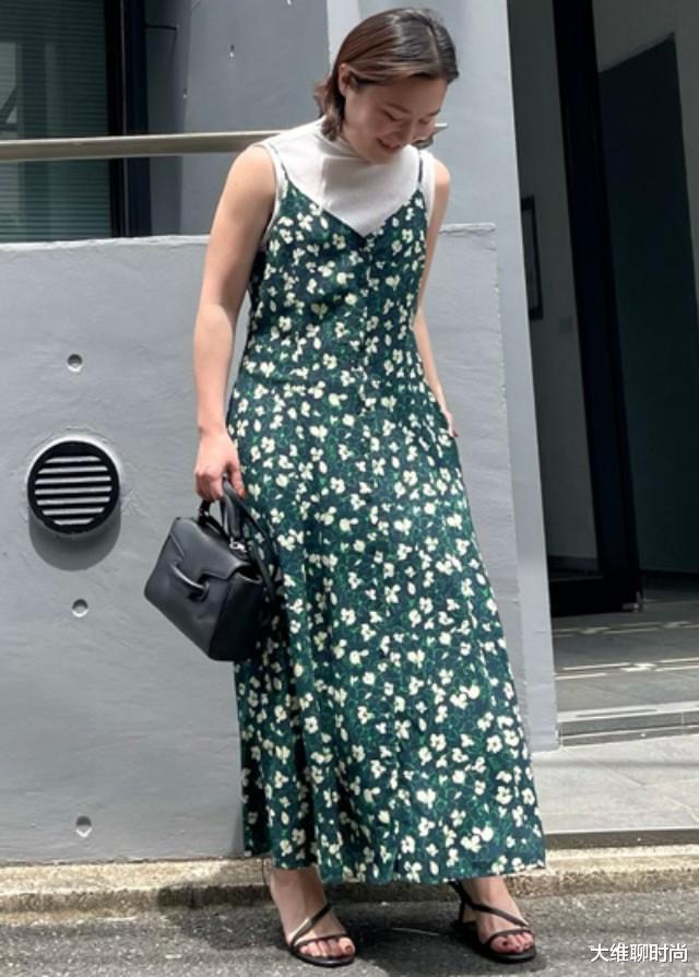 穿吊带背心连衣裙时,如果要保守一点的话,可以内搭一件白色背心,轮廓之美,走路时展开的下摆,营造出法式浪漫。
