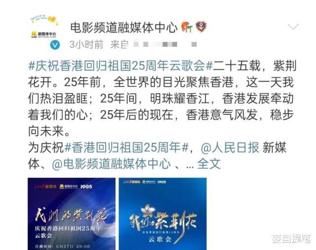 6月27日,央视电影频道官方公布了“庆祝香港回归祖国25周年云歌会”的嘉宾阵容。