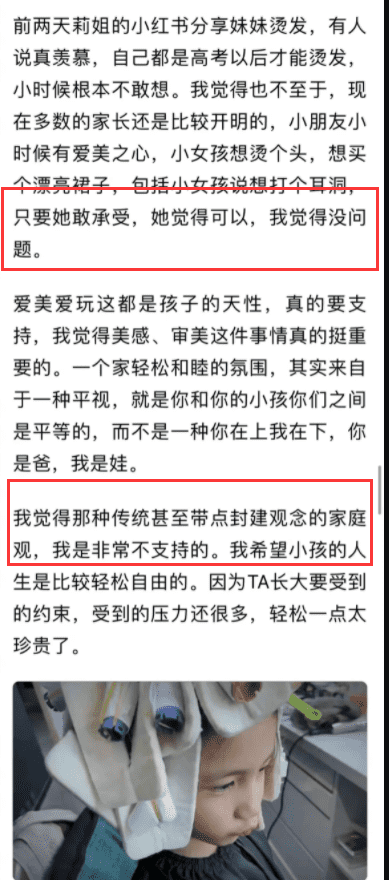 这样的开明应该已经让很多家长瑟瑟发抖了,也有一部分家长表示非常赞同,再说了,每个家庭都有每个家庭的教育观念,跟自己的不同不代表错误,没必要去指指点点!可以不赞成对方的做法,但是要给别人自由的权力啊,不能自己不喜欢又去要求人家一样这样的确不太好!
