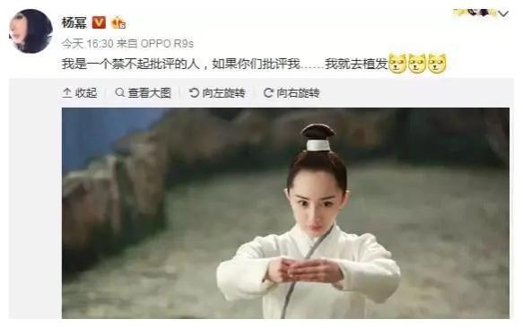杨幂之前发微博回应过网友们说她头秃的事,说自己是一个禁不起批评的人,如果再批评她发际线高她就要去植发了[偷笑]
