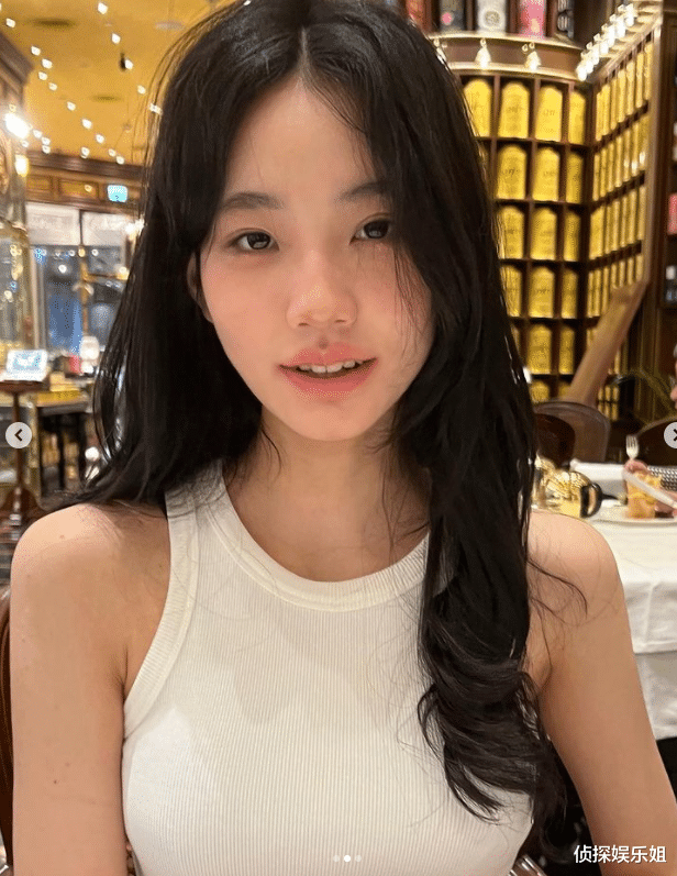 下图中,许韶恩露出一脸灿笑,心情好到飞起。她穿了一件白色背心,将少女身材完美展示。精致的五官配上优越的天鹅颈、直角肩,不可谓不养眼。再加上一头波浪卷长发,略显成熟。不得不说,许韶恩真是出落得越来越惹眼了,估计长大后会比妈妈还要美。