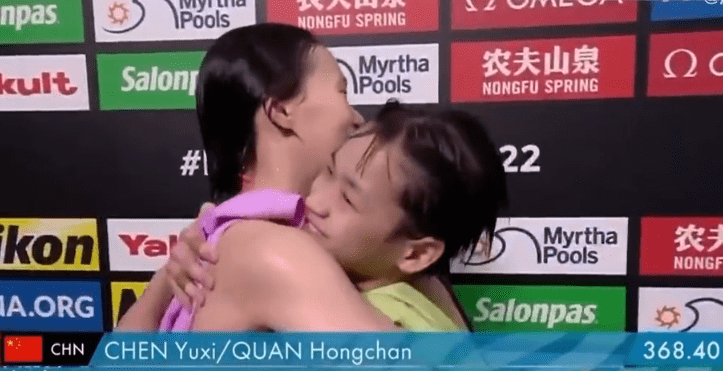 这次在和陈芋汐夺得金牌,全红婵也非常开心,和陈芋汐拥抱在一起,虽然对于观众来说,过程很轻松就夺冠,但对于参赛的运动员来说,她们需要忘记一切领先或者落后,每一跳之前都要平复内心,这样才可以做到最好。所以,赛后当看到得分是全场第一,而且是断层式第一,全红婵和陈芋汐也都开心的进行庆祝。同时亚军等人也都给全红婵和陈芋汐送上祝福的拥抱。