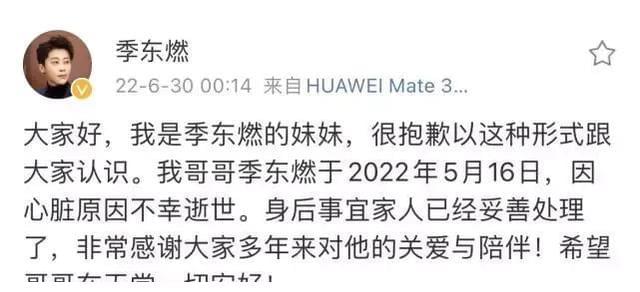 在2022年6月30日小编突然发现,季东燃的妹妹在哥哥的平台帐号发布了最新动态,说明哥哥的真正死因。大家好:我是季东燃的妹妹,很抱歉以这种方式跟大家认识。我哥哥季东燃于2022年5月16日,因心脏原因不幸逝世,身后事家人已妥善处理了,非常感谢大家多年来对他的关爱与陪伴!希望哥哥在天堂一切安好!