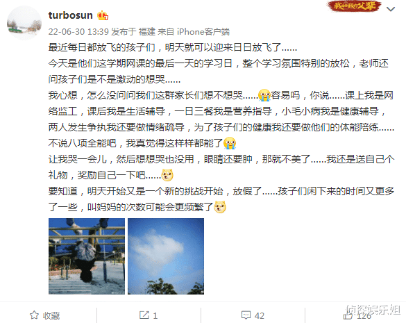 文末孙俪着重强调明天开始孩子们的暑假就正式启动了,于她而言又是一个新的挑战:“放假了……孩子们闲下来的时间又更多了一些,叫妈妈的次数可能会更频繁了”。不得不说,看到孙俪的发文真是又心疼,又觉得好笑,老母亲太不容易了。