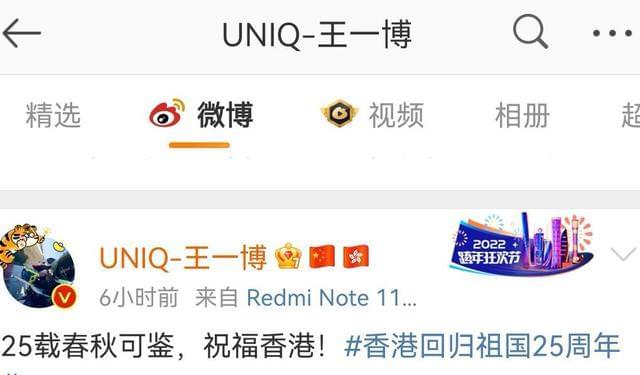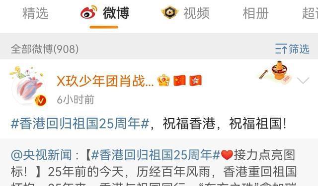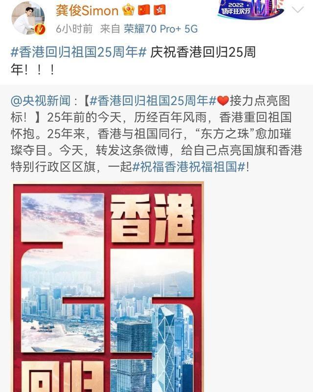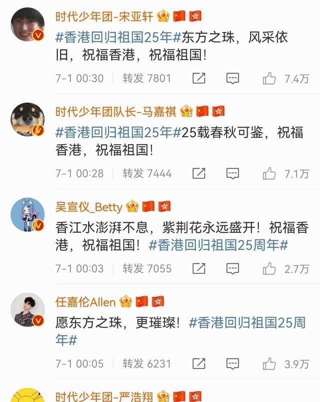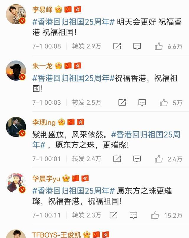 紧接着就是圈内多位明星发文送祝福,肖战说“祝福香港,祝福祖国”,王一博表示25载春秋可鉴,祝福香港!蔡徐坤说紫荆盛放时,香港正青春,祝福香港,祝福祖国。张艺兴文案写着“香江水澎湃不息,紫荆花永远盛开!祝福祖国繁荣富强!”龚俊言简意赅,一句庆祝香港回归25周年用了三个感叹号,振奋人心。