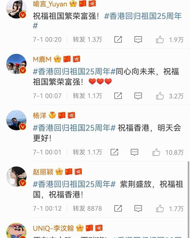 除此之外,刘雨昕、迪丽热巴、李易峰、朱一龙、李现、华晨宇、易烊千玺、王俊凯、王源、喻言、鹿晗、赵丽颖、宋亚轩、马嘉祺、吴宣仪、任嘉伦、许凯、杨幂、罗云熙等超过百位艺人纷纷发文送祝福,一起庆祝香港回归祖国25周年,满满的正能量。
