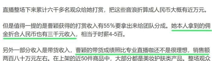 在一场7小时的美妆直播活动里,曹颖全程卖力吆喝,却远不及专业主播,而网友打赏的金额,在团队抽成之后,她仅能拿到3000多元。