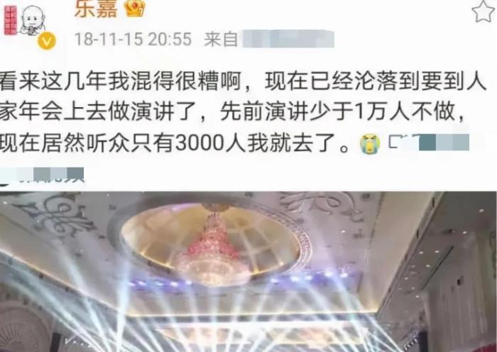 乐嘉本人就曾在社交媒体上自嘲,现在连年会演讲这种活儿,他都已经在接了,说好的不少于1万观众,最后3000观众的规模,他也妥协了。