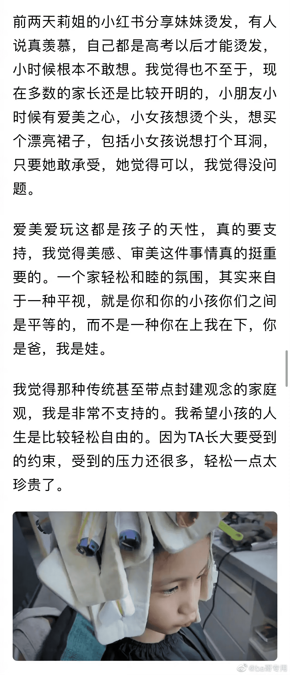 黄磊,发长文正面回应争议!6月30号,黄磊登顶热搜,因为他突然写了一篇文章,正面回应了前几天关于妻子和女儿的一些争议,网友看后再次议论纷纷。那到底怎么回事?事情是这样的,前几天,孙莉在某平台上,分享她带9岁的多妹去烫了头发的视频。不少网友看后,表示:这么小就烫头发,不好吧,不赞同这么做。对此,黄磊很认真地写了一篇文章,回应争议。他说:“小朋友小时候有爱美之心,想要烫个头、买个漂亮裙子,包括想打耳洞,只要她敢承受,她觉得可以,我就觉得没问题。”还说,爱玩,爱美是孩子的天性,真的要支持,要培养他们的审美。他喜欢和睦欢乐的家庭氛围。并说那种封建家庭的观念,传统的带点封建的教育观念,他很不支持。网友:爱美是人的天性[赞]羡慕这样的原生家庭,喜欢这样开明的家长~一直欣赏他对家庭和孩子的态度,不愧我喜欢的黄老师。有这样的家长真好,我都二十四了烫了头发家长叽叽喳喳了一礼拜,说烫发不好[流泪][流泪]也有网友表示:对她孩子烫发没意见,觉得也挺好看,但他们的圈子跟大众不同,我觉得他可以做,但不适合晒。因为大多数学生读的公立学校是不允许烫发的,他们是明星,更有示范作用,所以不该给要受这种束缚的大众这样的示范。