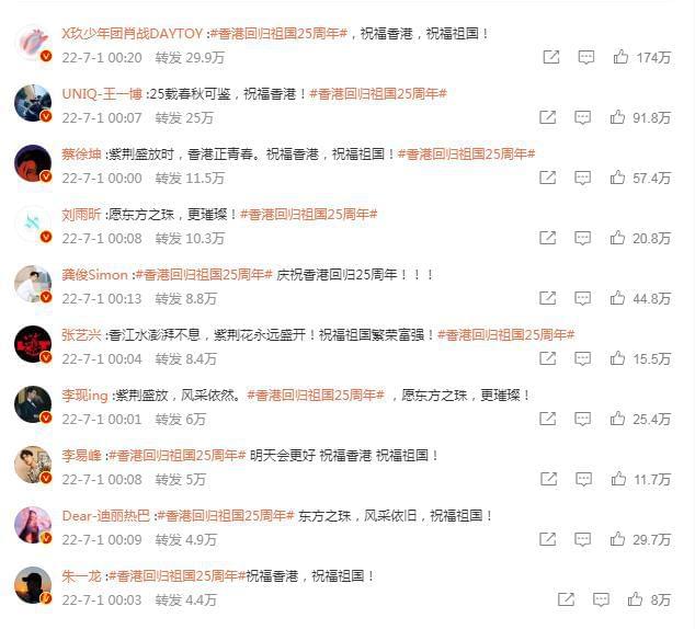 朱一龙、谢霆锋、容祖儿、蔡卓妍、钟欣潼、迪丽热巴、肖战、周冬雨、蔡徐坤、李现、李易峰、龚俊、王一博、张艺兴、易烊千玺、王俊凯、王源、杨洋、杨幂、赵丽颖、惠英红、黎明、莫文蔚等演艺界明星在社交平台发文,庆祝香港回归祖国25周年,为香港、为祖国送上诚挚的祝福。