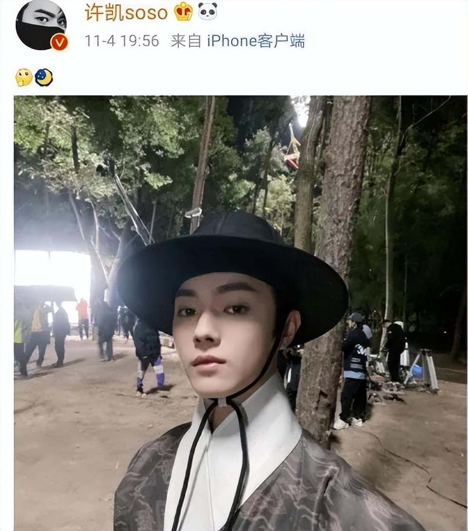 一名中国男演员在个人社交账号上晒出自己在某部明朝宫廷剧的造型。