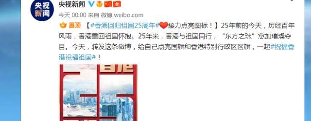置顶【#香港回归祖国25周年#[心]接力点亮图标!】25年前的今天,历经百年风雨,香港重回祖国怀抱。25年来,香港与祖国同行,“东方之珠”愈加璀璨夺目。今天,转发这条微博,给自己点亮国旗和香港特别行政区区旗,一起#祝福香港祝福祖国#!