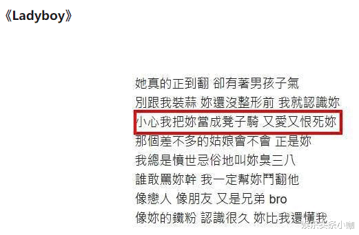 新歌《ladyboy》的歌词已经引起网友的强烈不适了!而且部分谐音还疑似内涵邓紫棋和Angelababy。开头部分这两句:别跟我装蒜,你还没整形之前我就认识你;小心我把你当凳子骑,又爱又恨死你。