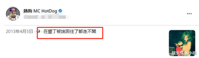 再说了,热狗是个公众人物,虽然嘻哈文化比较小众,但它并不是没人喜欢没人看。是公众人物就会有粉丝,他的这种行为很容易被粉丝模仿了去。2013年,热狗参加垦丁音乐节,在台上唱歌搞气氛,在台下抱辣妹,还发动态炫耀。