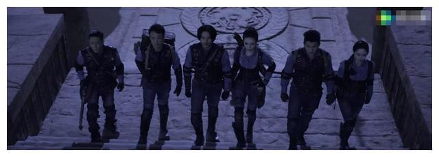 鞋子、手套、护肘、护膝等等配件,也都能看出是同一款式。再次下到龙岭迷窟,他们连背心里的着装也统一换成了蓝色的牛仔衬衫和牛仔裤。六个人往墓门前一站,又或者一起动作整齐划一地上楼梯、躲避机关,还是有一定视觉冲击效果的。