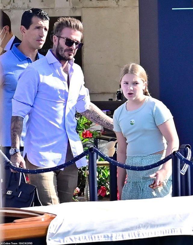 大卫·贝克汉姆和他唯一的女儿哈珀·赛文·贝克汉姆(小七)出现在威尼斯的一个码头上。父亲和女儿准备结束他们在著名水城的假期,回到英国伦敦。