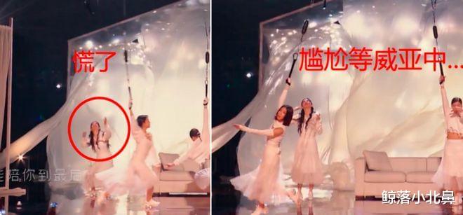 爬起来之后黄奕一下子就慌乱了,只见她抓了一下自己的头发像是在懊恼自己的失误,由于编排的舞蹈动作是利用威亚来完成,所以她只能尴尬地呆在原地等待威亚的下降。