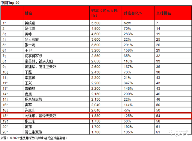 2021年,章泽天被财新峰会“女性领袖论坛”评选为年度创新力女性,并在当年的胡润富豪排行榜上,她和老刘以1880亿的财富,位居国内富豪第18名,全球富豪第54名。