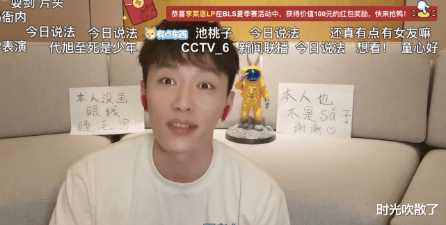 这次演池衙内火出圈,他在B站上直播,身旁一本正经地摆着两张自我介绍:本人不是傻子,本人没画眼线。