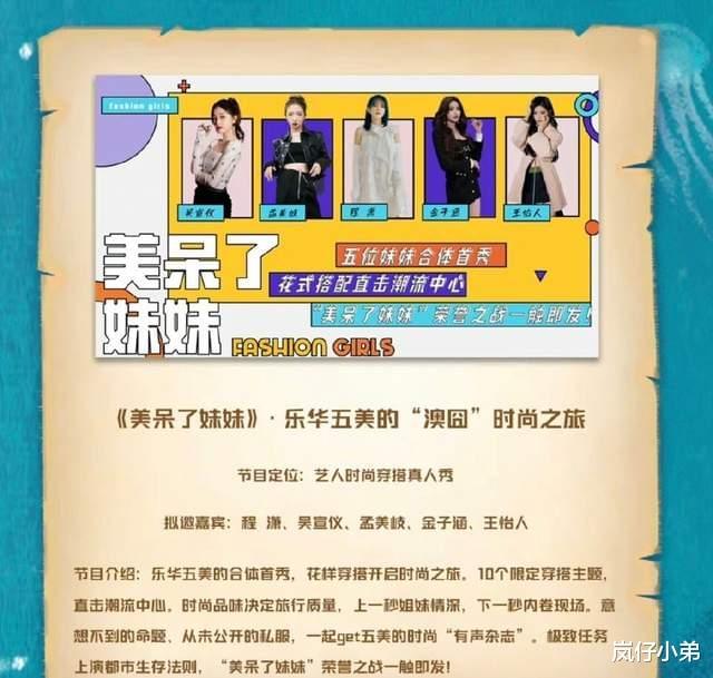 现在,又一档户外真人秀曝光了相关的物料,节目名字叫做《美呆了,妹妹》,节目将以YH旗下的吴宣仪、孟美岐、程潇、金子涵、王怡人五位女爱豆组成的小队,体验“澳囧”的旅程,消息一出,瞬间引发众多网友关注,定位就是以时尚穿搭的品味为主,上演五人的私服大比拼。