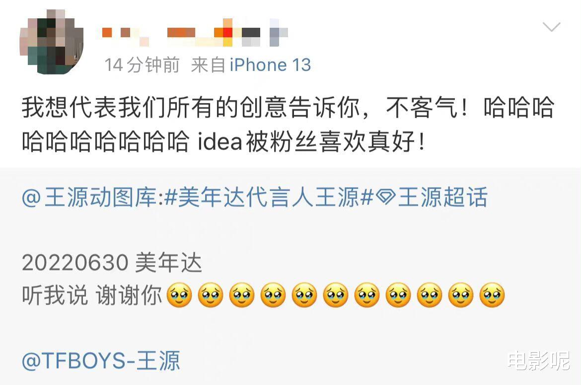 应该是负责这个广告的创意的工作人员也说王源是真的很配合,很敬业,是工作人员都想要自费为他买一个敬业的热搜了,王源的敬业配合是很多工作人员都透露过的,只要合作过的艺人还有工作人员都会很喜欢王源。