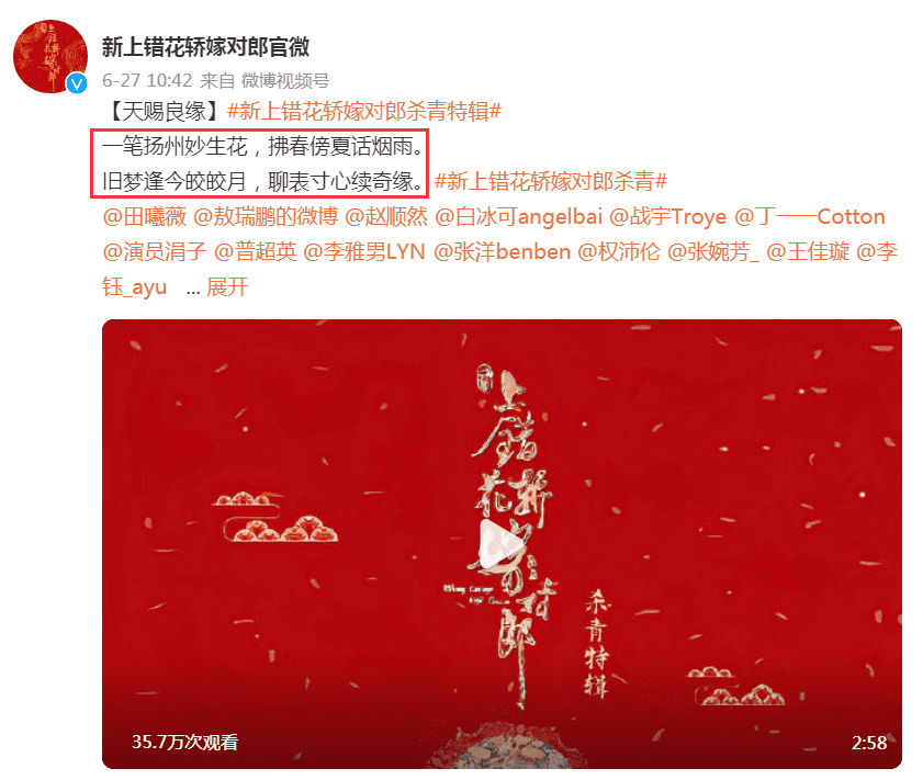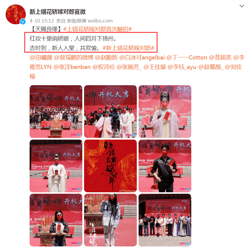 不过,前段时间,网上突然曝出这部剧要被翻拍的消息,并且官方也证实了这个消息,并晒出了《新上错花轿嫁对郎》的演员阵容以及开机大典合照,配文写道:“红妆十里俏娇娘,人间四月下扬州,吉时到,新人入堂,共欢愉。”