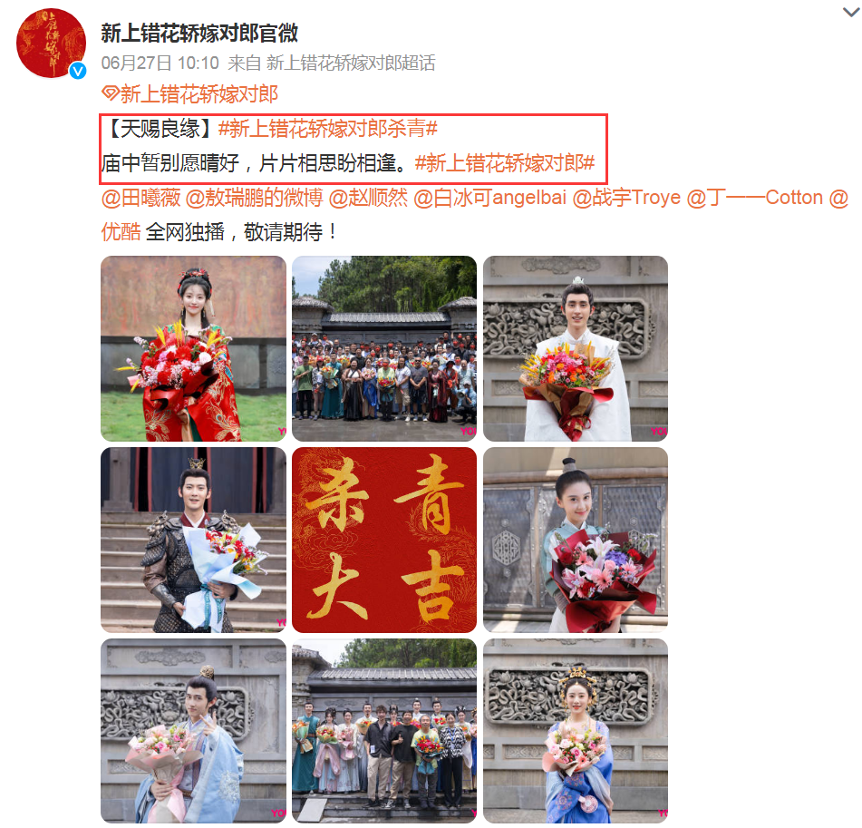 近日,《新上错花轿嫁对郎》官方账号官宣杀青,并晒出了每位主演的杀青照片,配文写道:“庙中暂别愿晴好,片片相思盼相逢。”
