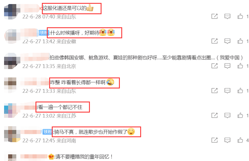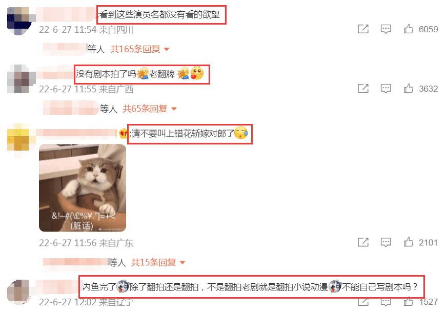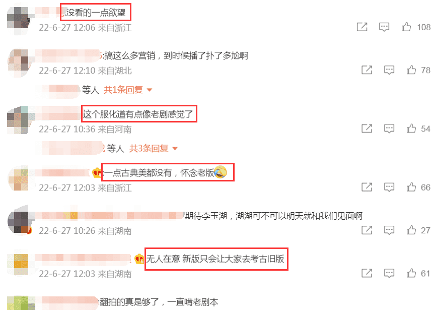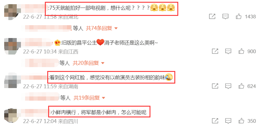 不过,不少网友看到这部剧的杀青特辑后,并不看好新版《上错花轿嫁对郎》,纷纷在底下留言写道:“看到这些演员名都没有看的欲望”,“没有剧本拍了吗,老翻拍”,甚至有人直接喊话剧组改名不要叫上错花轿嫁对郎了,“75天就能拍好一部电视剧,想什么呢?”,还有网友看到演员后表示傻傻分不清,感觉都长得一样,没有任何辨识度。