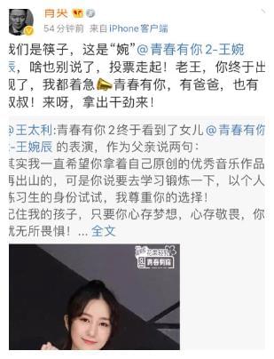 看来虽然不合体但依旧亲如兄弟,只可惜去年的青你2是最火爆的选秀综艺,热门选手太多,即便有筷子兄弟的加持,但王太利对女儿的疼爱溢于言表,肖央曾在参加节目时就曾爆料,有一次王太利看到女儿和男生坐在一起吃饭时,气得脸都红了。
