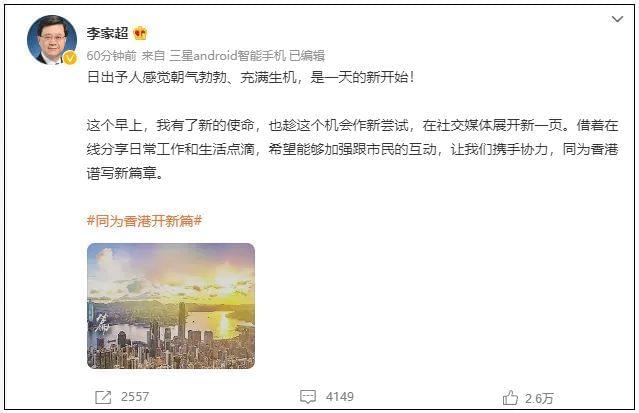 今天(7月1日),香港特别行政区第六任行政长官@李家超 发布了他的第一条微博:“日出予人感觉朝气勃勃、充满生机,是一天的新开始!这个早上,我有了新的使命,也趁这个机会作新尝试,在社交媒体展开新一页。借着在线分享日常工作和生活点滴,希望能够加强跟市民的互动,让我们携手协力,同为香港谱写新篇章。”