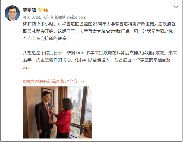随后,李家超发布了第二条微博期待就职典礼,感谢太太的默默支持: