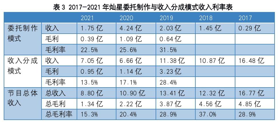 这两种模式各有利弊,前一种模式自2012的《中国好声音》所开创,对灿星来说风险较大,但一旦节目收视率高、广告收入上涨,能取得丰厚的收益,而且在这种模式下灿星往往会拥有节目新媒体端的独占开发与经营、发行权,收入来源更为多样化,例如2018年灿星三档主要台播综艺视频网站授权收入就达到3.11亿元。后一种模式对制作公司而言则基本上没什么风险,但收入的天花板也是非常明显的。下表中列出了2017-2021年期间灿星采用两种模式所取得的节目收入情况(2017年、2018两种模式分别的毛利情况未披露)。