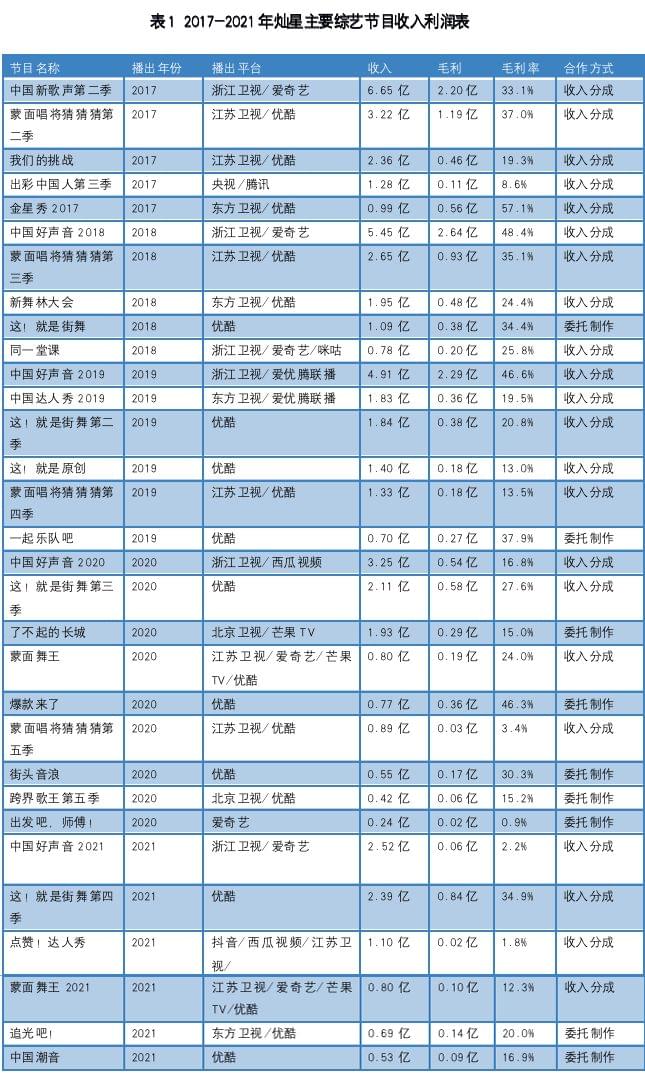 今天向大家展示的便是灿星历次招股书里所披露的2017-2021年间30余档综艺节目的收入利润情况,我们从中可以洞察到综艺节目市场近五年的一些走势。
