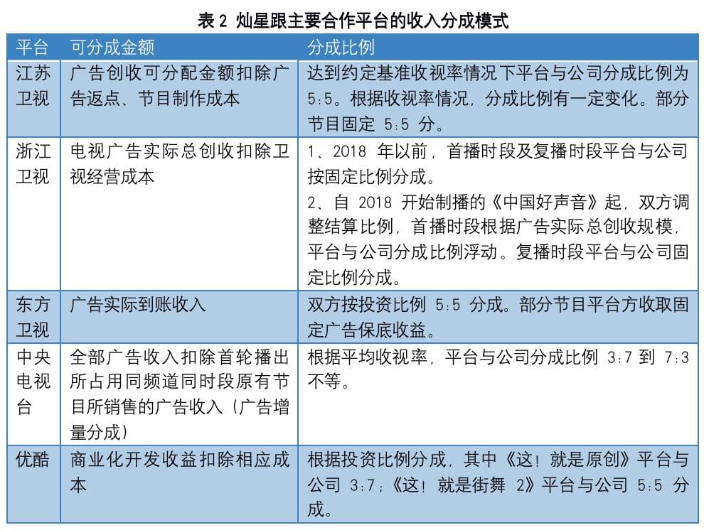 2019年时,灿星开始在网综领域也尝试收入分成模式,包括《这!就是街舞》第二季、《这就是原创》均与优酷展开分成合作。通过分成模式达到的收入从2018年的10.87亿增长至2019年的11.38亿。