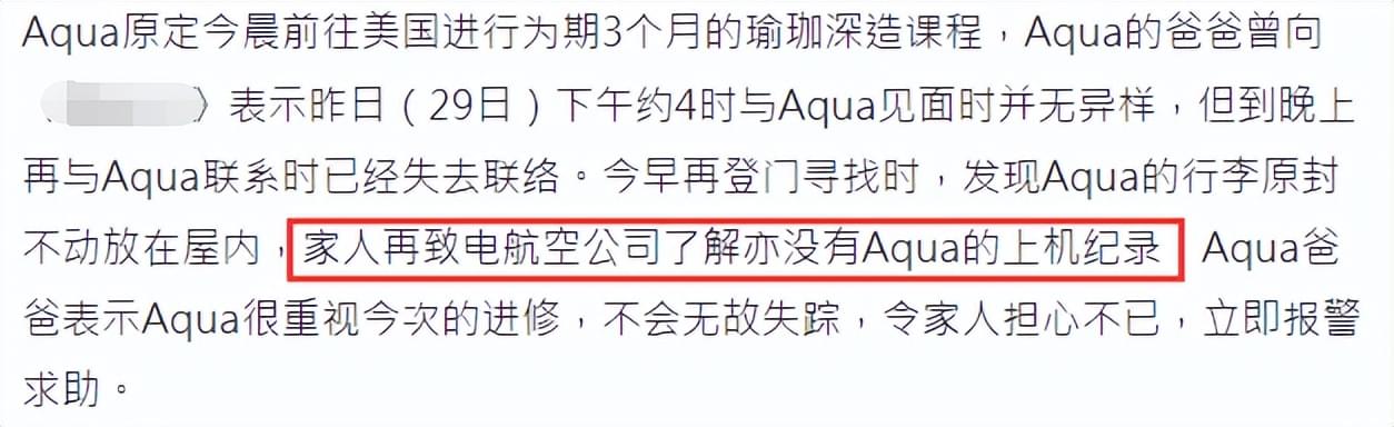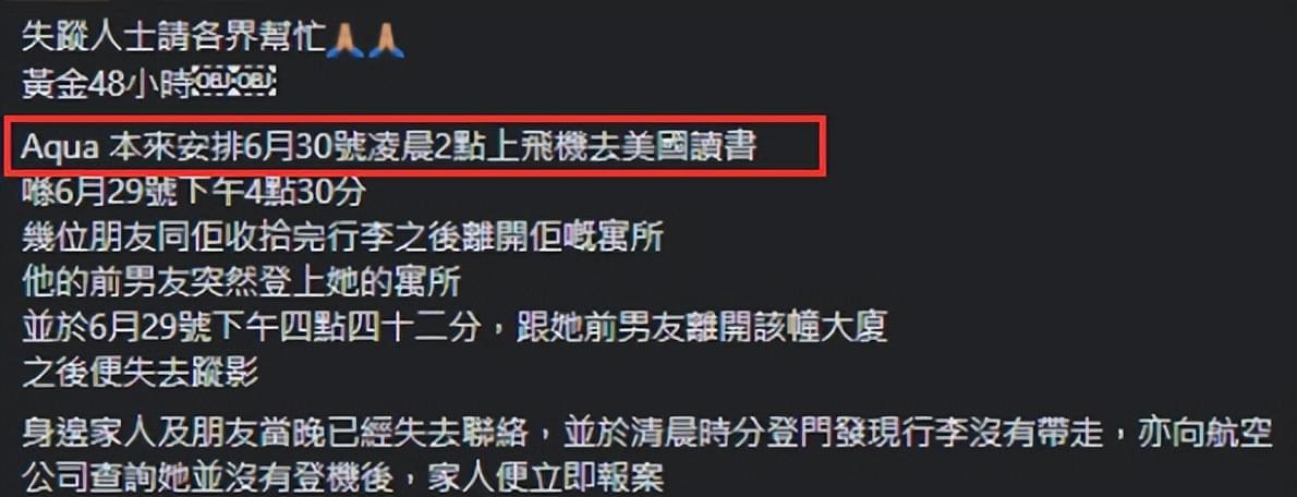 没想到到了当天的深夜,周慧贤的父母怎么都联系不上她,也就是从6月29号深夜开始,周慧贤失踪了!周慧贤父母到她的住处看过,准备好的证件和行李完整地放在原处,就是说周慧贤出门了但没有带上行李,周慧贤父母也联系了航空公司核实,证实了周慧贤也没有登上登往美国的航班。