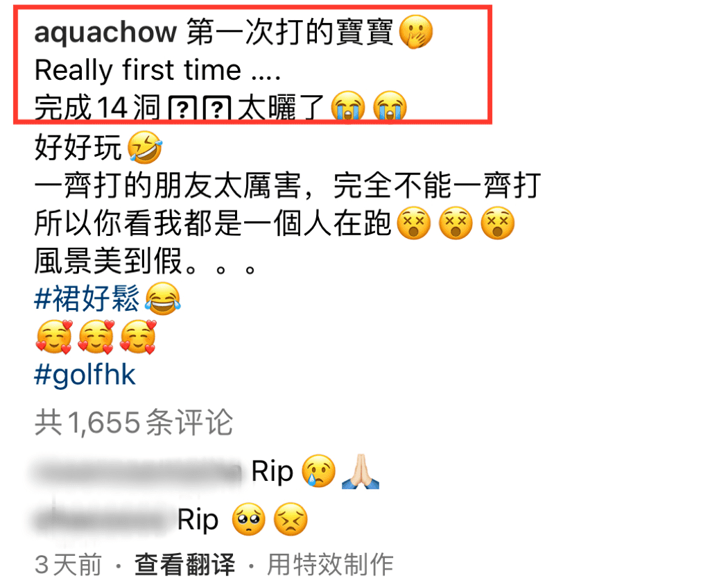 3天前,周慧贤曾在社交软件上分享自己首次打高尔夫球的激动心情和照片。