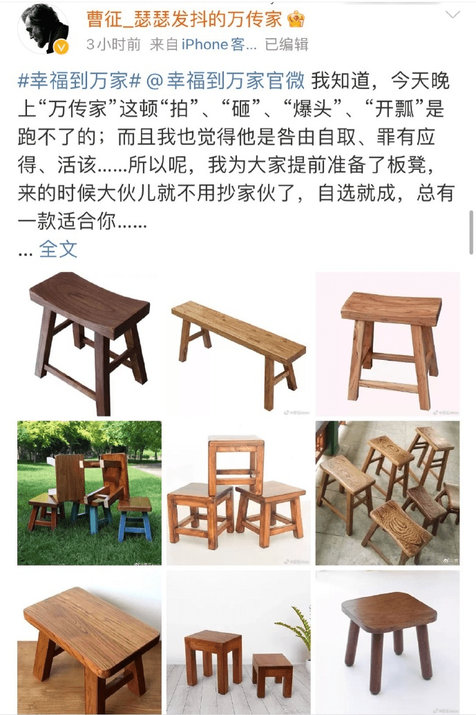 先是在被采的时候说万传家活该被打,接着在剧开播之前就将社交平台的名字改为“瑟瑟发抖的万传家”还自备了各种板凳,随便“拍”、“砸”、“开瓢”等等,隔着屏幕都能感受到的求生欲望。