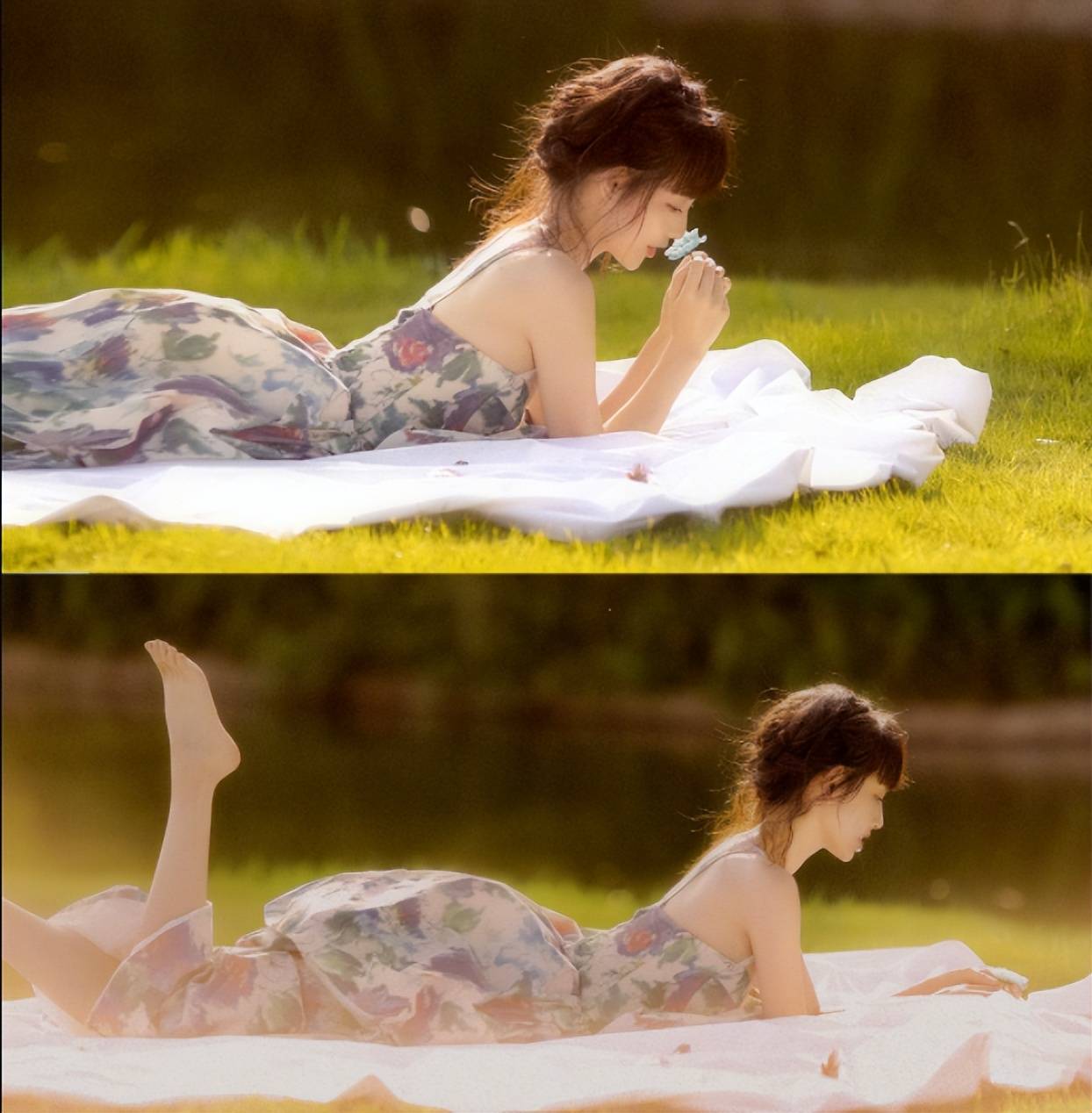 在后面的许多照片中,她躺在草坪上,身材前凸后翘,曲线十分迷人,尤其是挺翘的臀部和丰满的胸部,令人难忘。