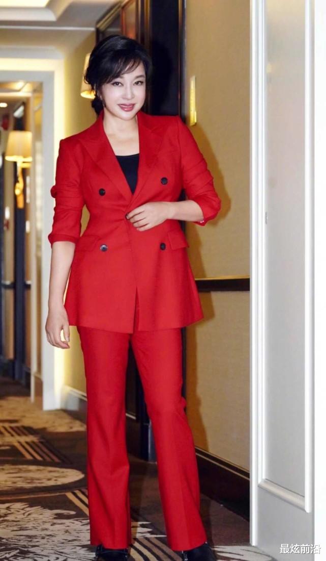 如果你在选择西服套装的时候,采用了一身黑色的搭配,那么就一定要格外地关注,服装版型和配饰点缀带来的衬托。黑色虽然足够经典百搭,但是也要掌握好其中的精髓所在,才能够将它最优秀的一面展现出来。建议大家在驾驭黑色西服套装的时候,可以像刘晓庆这样搭配一些翠绿色的耳环,或者是有光泽度的项链,而服装版型也要越简单越好,仅仅达到想要的修身遮肉感就足够了。
