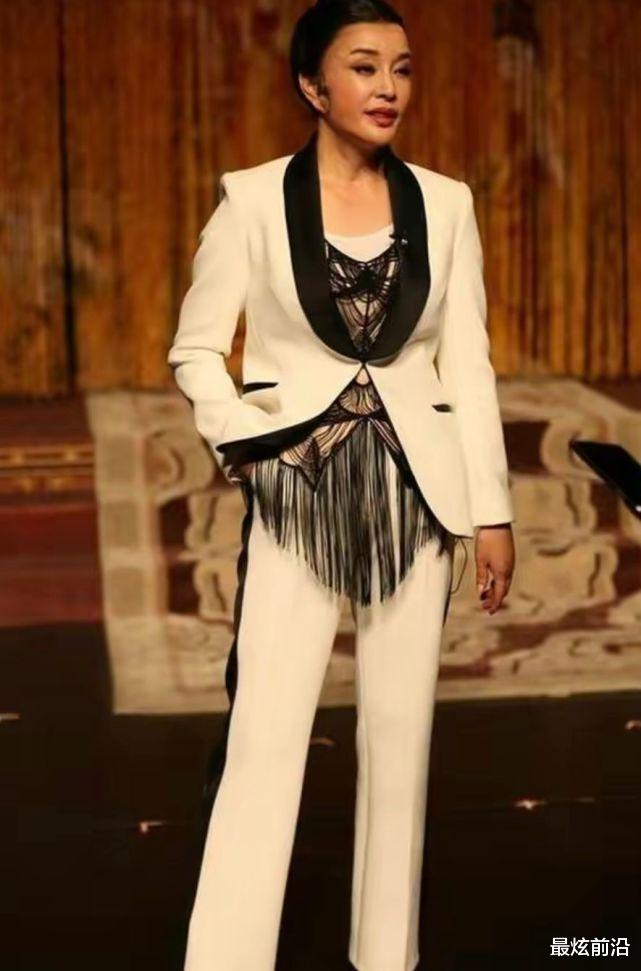 其实在搭配西装的时候,配饰的选择并不推荐,太浮夸张扬的款式,因为太吸睛的款式会夺走西装的优势和亮点,让整体造型看上去很有违和感。不过刘晓庆倒是很乐意用这种大面积覆盖的珠宝项链,和西双同色系的浅紫色宝石项链镶嵌在银色托盘上,显得格外高贵奢华。浅紫色又和服装形成了很好的层次感,打破了原本单调乏味的效果。