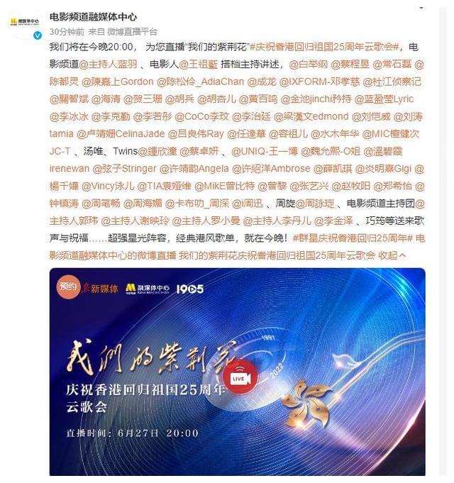 “我们的紫荆花”将由各位主持人共同讲述香港的故事,然后共同解锁关于香港的经典金曲,共同领略香港的风采。接着,电影频道融媒体中心发布了参与此次晚会的人员名单,其中主持人阵容以及艺人阵容颇为壮观。1、首先先来看一下主持人阵容。