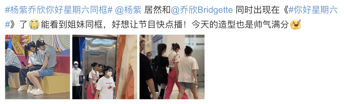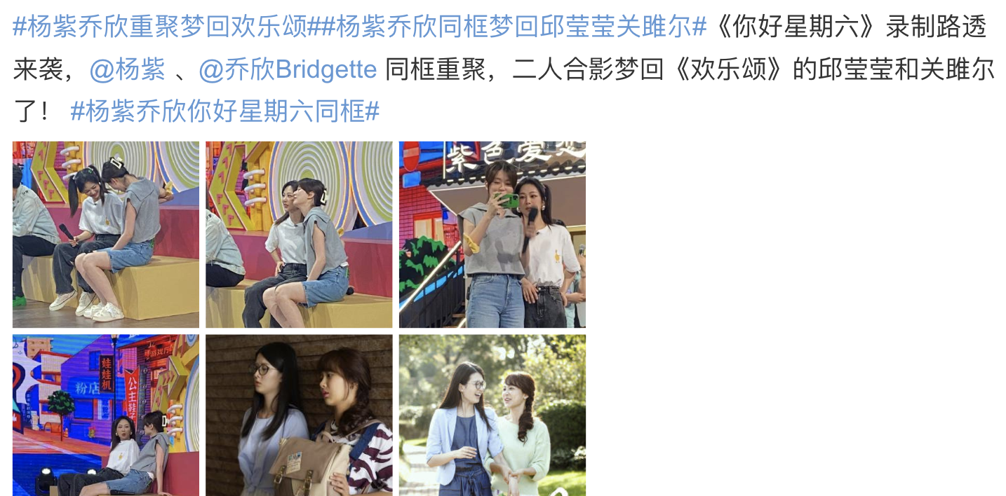 7月1日,网上曝光了杨紫和乔欣一起录制综艺节目《你好星期六》的路透照,两人久违同框,不禁让人梦回《欢乐颂》。